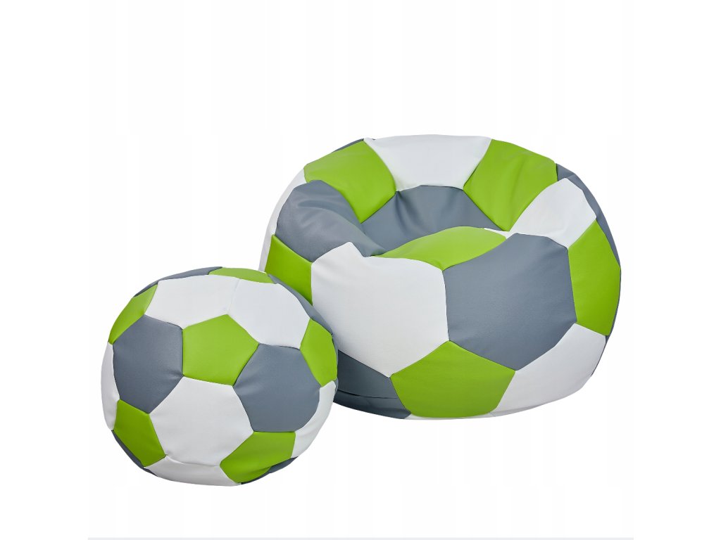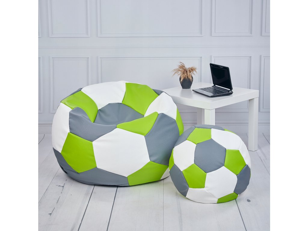 Sedací vak futbalová lopta XXXXL 100 cm s podnožníkom – bielo-šedo-zelená eko koža